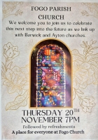 Everyone is welcome to celebrate this next step for Fogo Church. Fogo Parish Church on Thursday 20th November at 7pm followed by refreshments.